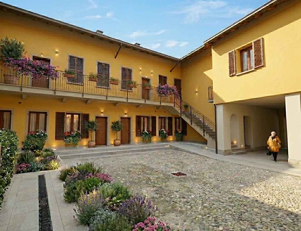 In raffinato contesto di corte, oggetto di completa ristrutturazione e riqualificazione energetica in classe A++++, proponiamo esclusivo appartamento cielo-terra in vendita con accesso indipendente.